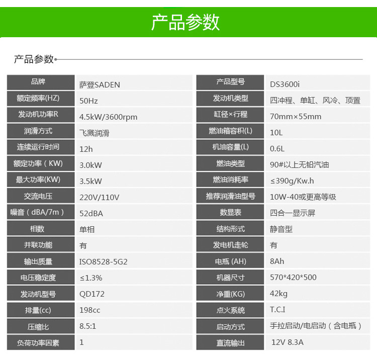 薩登3kw小型靜音汽油發(fā)電機(jī)DS3600i